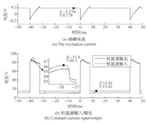 由圖7曲線結(jié)合圖2可知,在勵磁方向切換后,檢流電路檢測到的圖7(a)中的勵磁電流瞬間為負(fù),此時勵磁線圈處于電能泄放狀態(tài)并向能量反饋電路中的儲能電容充電。由于儲能電容充電,高、低壓切換電路的輸出電壓從80V逐漸升高;待勵磁線圈能量泄放完即勵磁電流為零時,儲能電容兩端電壓達(dá)到*高86V并開始放電,勵磁電流開始上升;儲能電容電壓降低至80V時,高低壓切換電路趨于80V的穩(wěn)定輸出狀態(tài),此時勵磁電流繼續(xù)上升;待勵磁電流上升至設(shè)定的超調(diào)量205 mA后,遲滯比較電路控制高低壓切換電路切換至17V低壓源作為勵磁工作電源,恒流電路在17V低壓源輸入下進(jìn)行恒流控制輸出。