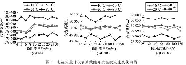 將實(shí)驗(yàn)測(cè)得的耐腐蝕排污管道流量計(jì)在不同溫度及流速下的儀表系數(shù)數(shù)據(jù)整理,特性曲線如圖1所示,3組曲線分別對(duì)應(yīng)DN40、DN80、DN100的3塊耐腐蝕排污管道流量計(jì)的儀表系數(shù)曲線。