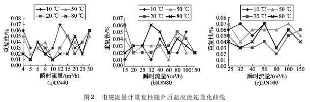 將實(shí)驗(yàn)測(cè)得的耐腐蝕排污管道流量計(jì)在不同溫度及流速下的重復(fù)性數(shù)據(jù)整理,特性曲線如圖2所示,3組曲線分別對(duì)應(yīng)DN40、DN80、DN100的3塊耐腐蝕排污管道流量計(jì)的重復(fù)性曲線。