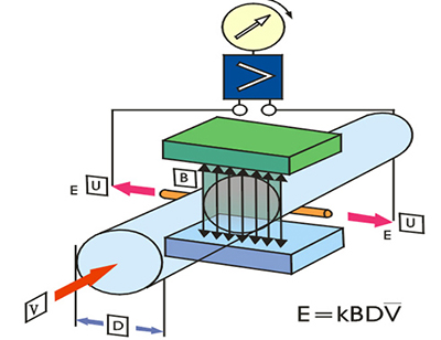 當(dāng)導(dǎo)電液體沿測量管在交變磁場與磁力線成垂直方向運動時,導(dǎo)電液體切割磁力線產(chǎn)生感應(yīng)電勢。在與測量管軸線和磁力線相互垂直的管壁上安裝了一對檢測電極,將這個感應(yīng)電勢檢出。