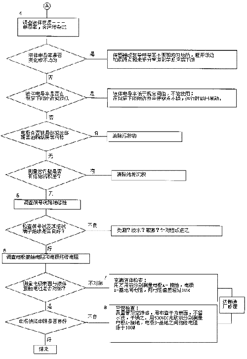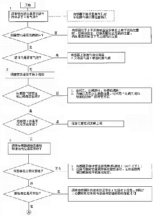 檢查流程圖*5項。信號回路絕緣下降會形成零點不穩。信號回路絕緣下降的土要原因足,包極部位絕緣下降所引起的,但也不能排除信號電纜及其接線端子絕緣下降或破壞。因為有時候現場環境十分嚴酷,稍一疏忽儀表蓋、導線連接處密封不慎,彌漫著潮氣酸霧或粉粒塵埃侵入儀表接線盒或電纜保護層,使絕緣卜降。信號回路絕緣電阻檢查分別按電纜側和流量傳感器側兩郵分進行,用兆歐表測試。因信號電纜容易可先做。流量傳感器再分兩次進行:充滿液體測黽電極表面接觸電阻和個管后測量,U極絕緣電阻。