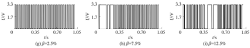 試驗發(fā)現(xiàn),氣相的加入對過熱蒸汽流量計測量的影響顯著,譜分析和脈沖計數(shù)兩種方法隨著氣相注入的增加其表現(xiàn)也不同。圖4反映了水流量12m3/h時,注入不同氣含率β時A點的模擬信號,如圖4(a~c)所示;經(jīng)譜分析后得到的頻率值,如圖4(d~f)所示;用脈沖計數(shù)方法得到的脈沖信號,如圖4(g~i)所示。圖4顯示,當注入氣量不大時,對過熱蒸汽流量計的影響不大,無論是譜分析結(jié)果還是脈沖計數(shù)得到的結(jié)果都比較好。當注入的氣量進一步增加時,渦街原始信號強度和穩(wěn)定性逐漸變差,渦街頻率信號會被干擾信號所淹沒,反映到譜分析圖是,渦街頻率的譜能量減小,干擾信號的譜能量加強;對于脈沖信號,會因為一些旋渦信號減弱,形成脈沖缺失現(xiàn)象,而不能真實地反映渦街產(chǎn)生的頻率。