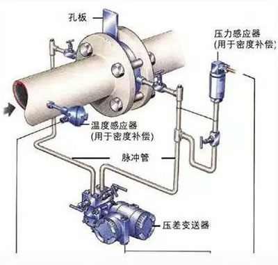 通過引壓管將差壓信號引入差壓變送器,差壓變送器將差壓信號送入流量積算儀,積算儀將差壓信號換算成流量信號。同時通過溫度和壓力傳感器測出蒸汽的溫度和壓力,積算儀根據(jù)當時的溫度和壓力計算出補償后的流量。