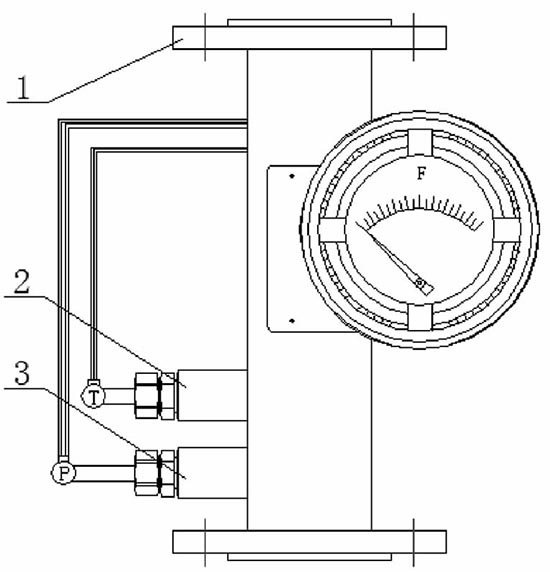 流量計、溫度變送器、壓力變送器單獨安裝,流量信號、溫度信號、壓力信號分別輸入DCS或控制計算器進行流量的溫度、壓力補償計算,完成流量、壓力、溫度各參數的顯示、輸出、打印等功能。此種結構安裝靈活,特別適用于現場流量計的升級改造,如圖2所示。號、溫度信號、壓力信號輸入到溫壓補償功能設計的流量計轉換器中,進行流量的溫度、壓力補償計算,完成流量、壓力、溫度各參數的顯示、輸出、打印等功能。此種結構測量準確度高,體積小,安裝方便,如圖3所示: