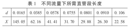 3.直管段長度和成品油流量計(jì)精度的初步預(yù)測在工程設(shè)計(jì)中,根據(jù)流體性質(zhì)、流量和雷諾數(shù)確定α和d值。這樣,按照式(5)就可以依不同的流量計(jì)精度要求,對直管段長度進(jìn)行初步預(yù)測,或確定直管段長度后,對流量計(jì)的精度做初步預(yù)測。當(dāng)δ= 0.2%時(shí),不同流量下所需直管段長度見表1。