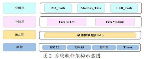 Modbus 通訊模塊的軟件架構(gòu)如圖 2 所示,分為硬件層、硬件抽象層,中間層和應(yīng)用層。中間層包括一個(gè)實(shí)時(shí)操作系統(tǒng)FreeRTOS 和一個(gè)針對嵌入式環(huán)境開發(fā)的輕量級 Modbus 協(xié)議庫Freemodbus。在應(yīng)用層,主要?jiǎng)?chuàng)建了三個(gè)任務(wù),232_Task 負(fù)責(zé)讀 取和解析流量計(jì)表頭輸出的文本信息,Modbus_Task 負(fù)責(zé)存儲(chǔ) 解析后的流量計(jì)數(shù)據(jù)到 Modbus 寄存器表,以及以 Modbus 協(xié)議與取水監(jiān)測設(shè)備通信,LED_Task 是一個(gè)輔助任務(wù),主要用來提示程序運(yùn)行狀態(tài)。