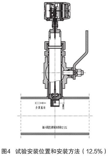 根據(jù)中華人民共和國(guó)機(jī)械行業(yè)標(biāo)準(zhǔn):JB/T9249-2015《壓縮空氣流量計(jì)》進(jìn)行插入式壓縮空氣流量計(jì)的研制與設(shè)計(jì)。在試驗(yàn)過(guò)程中,因?yàn)槔碚撗芯坎怀浞郑偌由辖?jīng)驗(yàn)不足,采用插入深度是按照以往其它產(chǎn)品(插入式電磁流量計(jì))的經(jīng)驗(yàn),以插入深度為現(xiàn)場(chǎng)管道內(nèi)徑的 12.5% 進(jìn)行試驗(yàn),其對(duì)介質(zhì)流量的檢測(cè)值與同種規(guī)格管道法蘭式結(jié)構(gòu)的壓縮空氣流量計(jì)進(jìn)行比較,偏差值較大、儀表準(zhǔn)確度無(wú)法滿足設(shè)計(jì)要求。試驗(yàn)安裝位置和安裝方法如圖 4 所示。