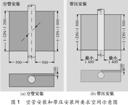 (1)要確認在用智能液體流量計的管壁厚度及內襯材料特性,保證換能器在管段內壁的突出長度;(2)用氣焊切割智能液體流量計外殼時,一定要在管道內充滿水的情況下(*好是帶壓并繼續保持管內水在運行流動的狀態)進行,以免內襯受熱凸起變形影響流態;(3)要有足夠安裝空間(流量井),可以用原有的流量井,但管壁與流量井墻壁*小距離不小于 500 mm,流量井長不小于 1. 5 倍管徑。超聲波流量計空管安裝和帶壓安裝要求空間如圖 1 所示。