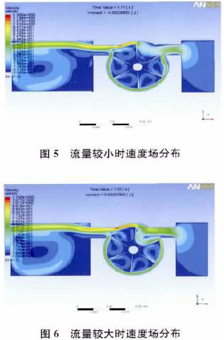 (1)數值仿真結果與物理實驗結果基本一致,當流速低于啟動排量,渦輪未啟動時,流體沿葉片做繞角運動,葉片兩側壓力相等,葉片不轉動;當流速高于啟動排量,渦輪轉動時,流體在腔內產生旋渦,造成葉片兩邊壓差,從而造成葉片轉動。