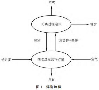 浮選是依據礦物原料表面的化學性質,向待浮選的礦漿中加入浮選藥劑和空氣,使其與礦漿充分融合,并根據各礦物原料的黏附程度的不同,分選出不同的礦物。浮選過程一般分為礦漿碰撞、黏附、上浮以及精煤溢出四個階段。礦物原料在浮選藥劑的作用下,與 空氣發生器產生的小氣泡發生充分碰撞,進行礦物捕集。利用礦物間的疏水特性,礦物粘附于氣泡表面,氣泡不斷上浮,形成精礦泡沫層,精礦溢出浮選柱;由于尾礦的親水特性,尾礦沉入底部并排出。浮選流程如圖1所示。