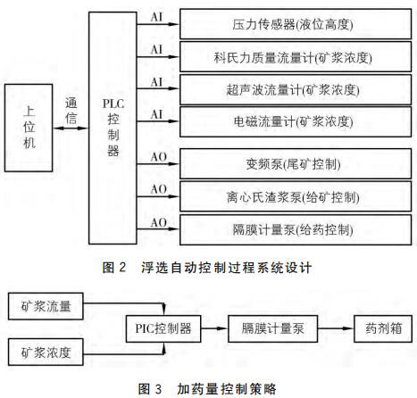圖3中的礦漿流量與礦漿濃度分別由科氏質量流量計和超聲波流量計測得,并 以4~20mA 電流信號傳送給 PLC控制器。由 PLC控制器根據電流信號值計算出實際的礦漿濃度和礦漿流量值,對上述兩個值進行邏輯處理以及運算,得出實時加藥量。PLC 控制器將計算出的實時加藥量數據以4~20mA 的電流信號發送給隔膜計量泵,由其控制并實現加藥量過程的自動控制。