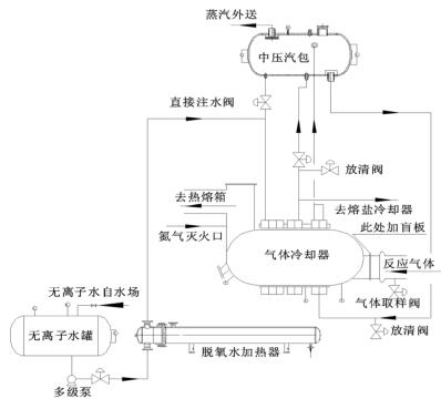 來自無離子水罐的脫氧水經(jīng)多經(jīng)泵加壓、經(jīng)脫氧水加熱器加熱后進入到智能型渦街流量計的水段,脫氧水與反應(yīng)氣體換熱后分兩路:一路進入中壓汽包,保證汽包有穩(wěn)定的液位;一路進入熔鹽冷卻器帶出熔鹽攜帶的反應(yīng)熱。來自中壓汽包的高溫水經(jīng)管路接至智能型渦街流量計汽段底部,高溫水與反應(yīng)氣體換熱后產(chǎn)生高壓蒸汽,高壓蒸汽又返回中壓汽包。汽包還有一路直接注水管路,此路水不經(jīng)過智能型渦街流量計水段,而是直接進入汽包。在智能型渦街流量計出口溫度偏低而汽包液位也比較低時,可開此直接注水管路來穩(wěn)定汽包液位。其詳細流程圖如圖 2。