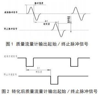 將智能型電磁流量計流量與相關測試設備連接起來,就可以進行智能型電磁流量計的校準,時間差△ t 由專用試驗測試設備可以測出。起始脈沖信號和終止脈沖信號如圖 1 所示。經過專用試驗測試設備信號轉化后的信號方波如圖 2 所示。