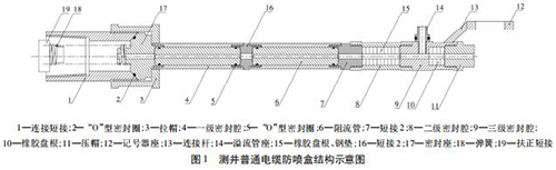 注入剖面測試中,溢流量對測量結(jié)果影響至關(guān)重要。如圖 1 所示,測井普通防噴盒采用 3 級密封: * 1 級密封為阻流管( 6) ,測 20 井次左右阻流管內(nèi)徑變大,溢流量增加; * 2 級為橡膠盤根和鋼墊( 15) ; * 3 級為橡膠盤根( 10) ,調(diào)整壓帽( 11) 松緊程度,橡膠盤根抱緊電纜; * 2 級和* 3 級密封更換一次橡膠盤根測試 3 ~ 5 井次溢流量增加。普通防噴盒無法實現(xiàn)溢流量,沒有捕捉器、防噴器和放噴組裝件。普通電纜防噴裝置工作壓力20 MPa,耐壓 40 MPa。