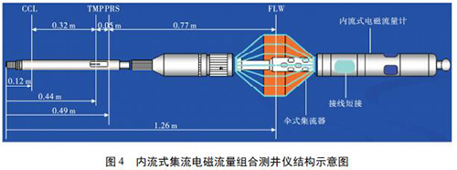 1. 2 內(nèi)流式集流智能型渦輪流量計如圖 4 所示,內(nèi)流式集流電磁組合測井儀主要采用內(nèi)流式集流智能型渦輪流量計,并組合了井溫壓力磁定位儀。利用電磁感應原理測量平均流速,體積流量計算公為: