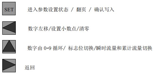 設(shè)置小數(shù)點(diǎn):直接按 SET 鍵確認(rèn),進(jìn)入默認(rèn)流量參數(shù)設(shè)置菜單,顯示屏顯示 QP,按數(shù)字↑ 鍵設(shè)置標(biāo)志位。按數(shù)字← 鍵設(shè)置小數(shù)點(diǎn),按→鍵可以返回菜單選擇項。