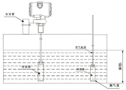 高溫投入式液位計工作原理式為:Ρ = ρ .g.H + Po